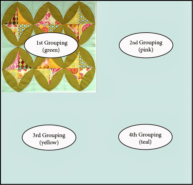 Layout blocks as shown above. Sew to form rows sew rows to form a 13" x 9 1/2" block unit. Note: At this point, iron seams open to eliminate bulk.