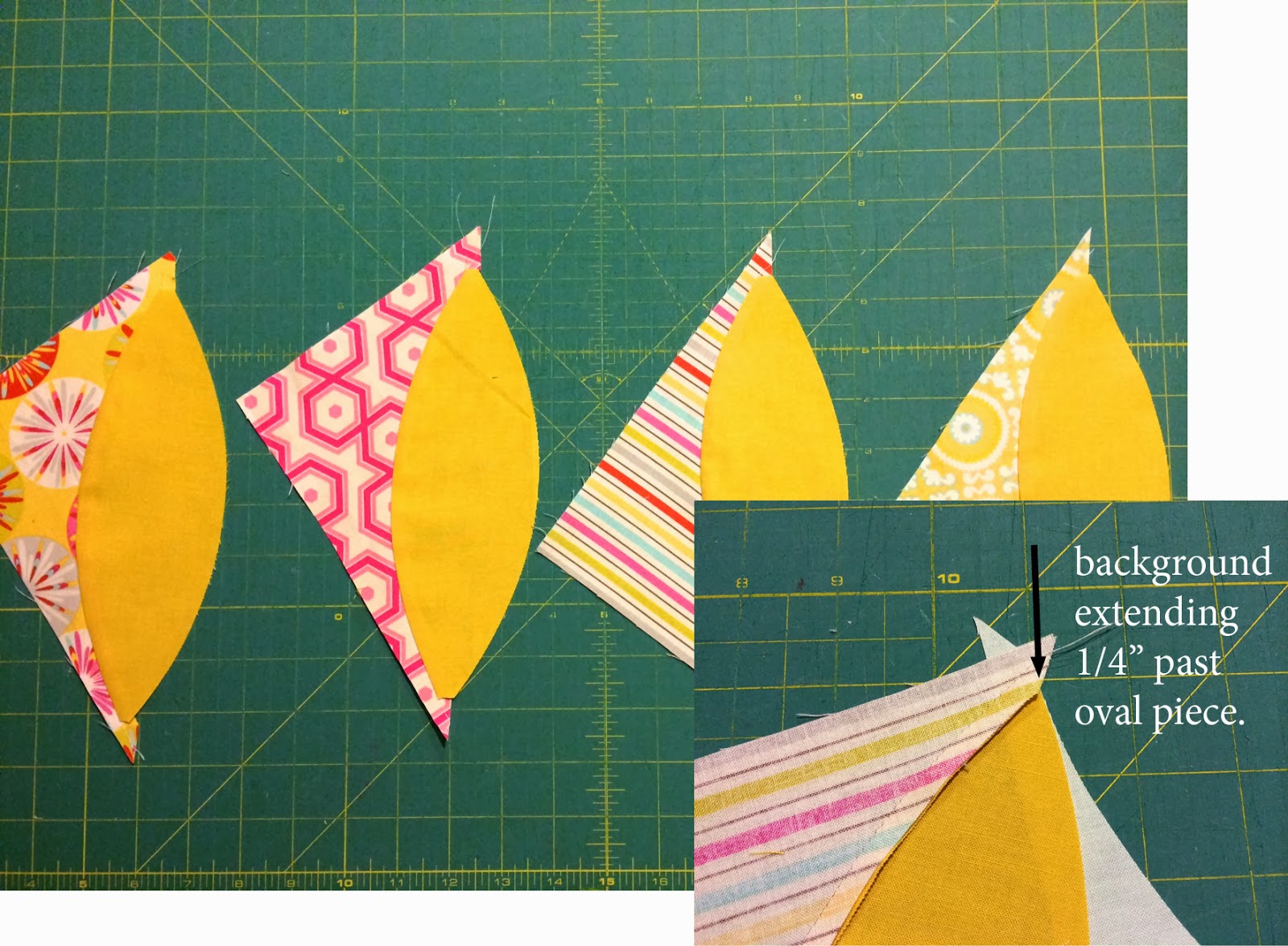 Rotate ruler, make sure to align dotted lines on top and bottom edges and the 3" vertical line is over corners of the cut you just made. (sample above in white circles) Cut in "curve cut out". Repeat these steps for 5 more oval sets, two per set. You will end up with 12 ovals per strip, 96 total.